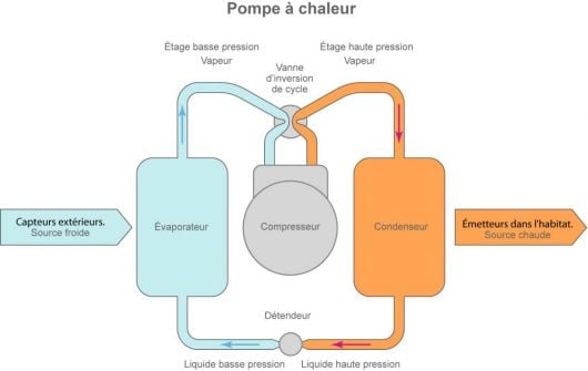 Cette chaleur générée est restituée au milieu à chauffer via un condenseur, où le fluide se refroidissant repasse à l’état liquide.