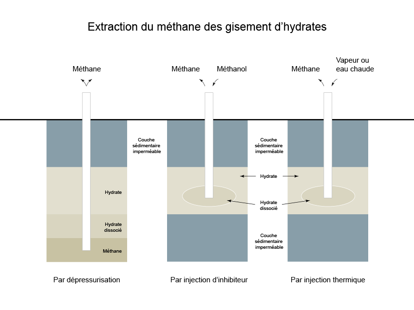 Trois méthodes d’extraction du méthane sont à l’étude :