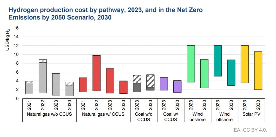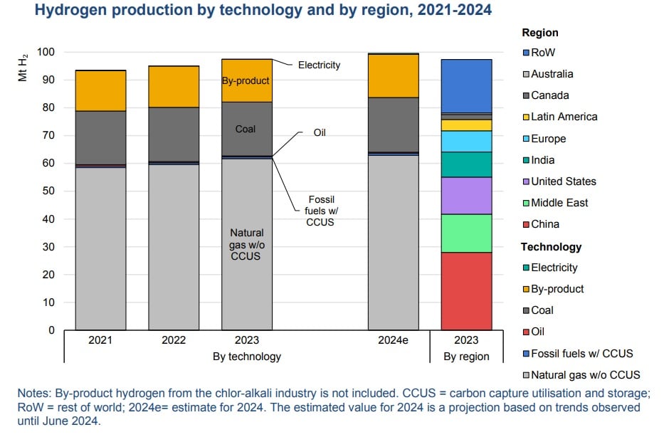 Selon l'AIE, la production mondiale d'hydrogène « bas carbone » en 2023 était encore limitée à moins de 1% de la production mondiale (moins de 1 million de tonnes), « et majoritairement à partir d'énergie fossile, avec captage, stockage et utilisation du CO2».