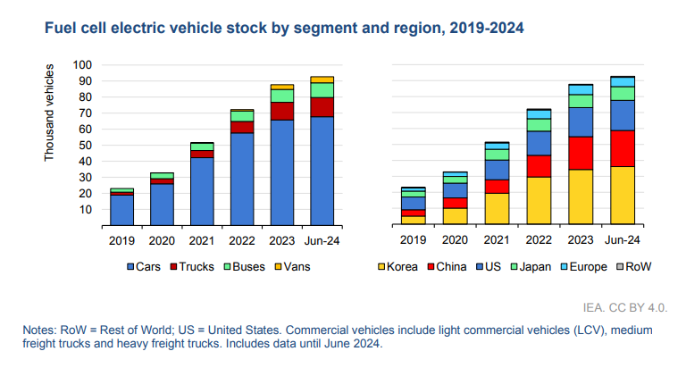 À fin juin 2024, près de 93 000 véhicules à pile à combustible (tous modes confondus) étaient en circulation dans le monde selon l'AIE.