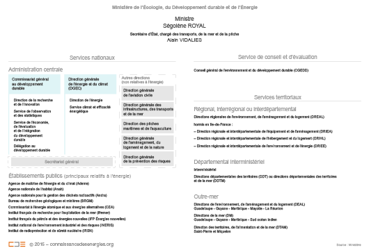 Le ministère de l’Écologie, du Développement durable et de l’Énergie est entre autres en charge des problématiques énergétiques en France et de la prise en compte des problématiques de développement durable dans toutes les politiques publiques.. Les différents changements de nom du ministère ont contribué à rendre peu lisible ses champs de compétences et sa structure. Ce flou est souvent renforcé par le croisement des enjeux industriels, environnementaux et économiques dans le domaine des énergies.
