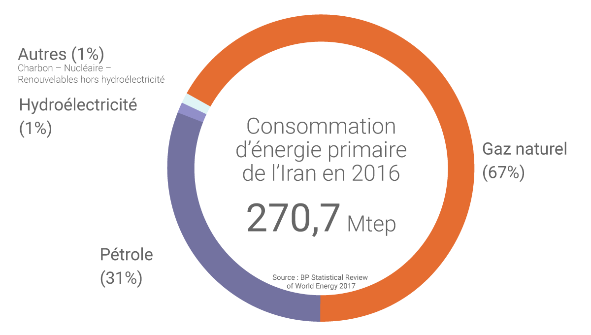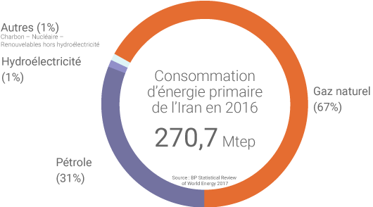 Membre de l’Organisation des Pays Exportateurs de Pétrole (OPEP), l’Iran satisfait l’essentiel de sa consommation énergétique (270,7 Mtep en 2016)(2) grâce à la richesse de ses ressources intérieures en hydrocarbures.