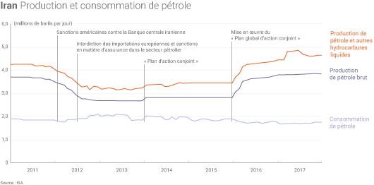 Depuis la levée des sanctions internationales en janvier 2016, l'Iran souhaite fortement augmenter ses exportations. En 2017, la production pétrolière nationale a retrouvé un niveau comparable à celui de 2011, avant les sanctions internationales (niveau qui reste inférieur à la production de 1976/1977 qui dépassait 5,5 Mb/j).