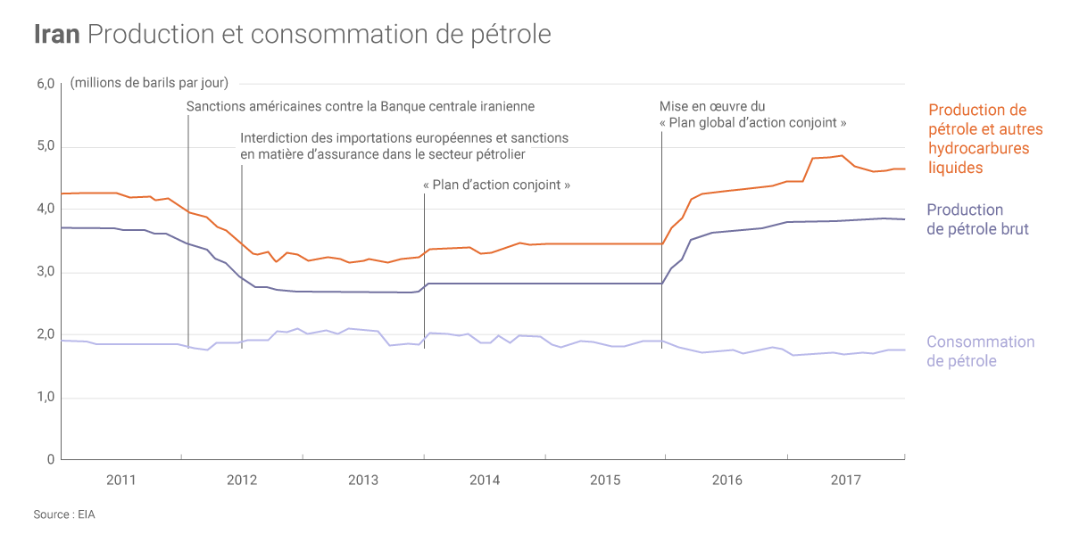 La production iranienne de pétrole a rapidement réaugmenté après la levée des sanctions internationales en janvier 2016. (©Connaissance des Énergies, d'après EIA)