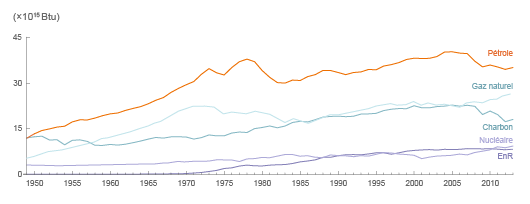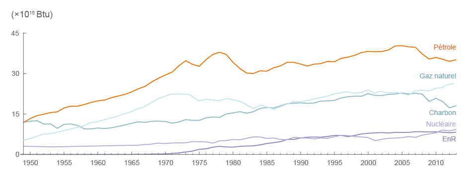 Évolution de la consommation d’énergie américaine depuis 1949 (©Connaissance des Énergies, d'après EIA)