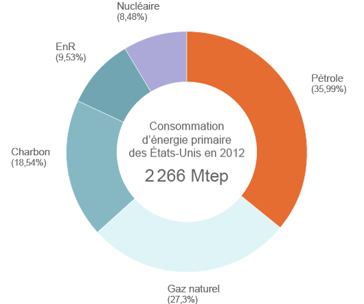 Le recours aux énergies fossiles reste particulièrement important aux États-Unis : près de 82% de la consommation américaine d’énergie primaire est satisfaite par ces énergies carbonées. Comme dans de nombreux autres pays, le pétrole est la principale énergie consommée aux États-Unis (36% de la consommation d’énergie primaire en 2013). Cette prépondérance particulièrement marquée peut, entre autres, s’expliquer par l’importance du transport routier. Suivent le gaz naturel (27,3%) et le charbon (18,5%)