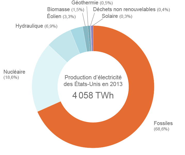 Les États-Unis génèrent à eux-seuls près d’un cinquième de l’électricité produite dans le monde (4 058 TWh en 2013). Le mix électrique américain repose encore pour plus des deux tiers sur des combustibles fossiles. Il reste par conséquent très carboné.