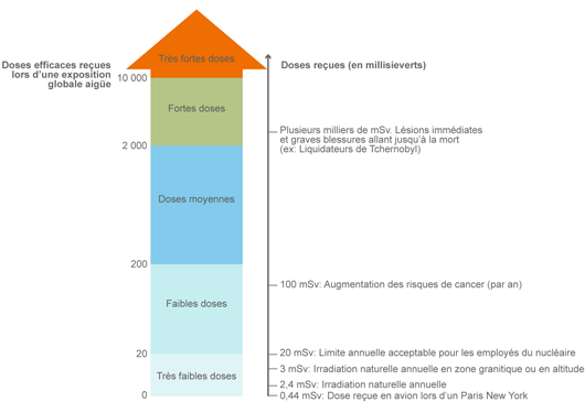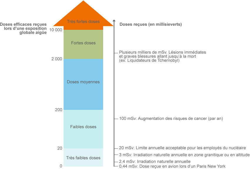 Ci-dessous, une échelle des radiations rappelle que la radioactivité est un phénomène naturel et qu’elle n’est toxique qu’à très forte dose. Lors d’une exposition globale aigue, on assiste à l’apparition de nausées et à une baisse des globules blancs à partir de 1 000 mSv. Un des enjeux actuels est l’évaluation des effets de doses plus faibles de rayonnements ionisants (inférieures à 100 mSv) à moyen ou long terme :