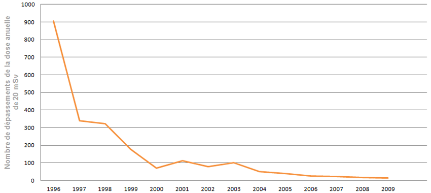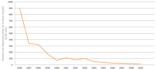 La dose annuelle cumulée maximale, reçue par les travailleurs du nucléaire, est fixée à 20 mSv par an. Dans les faits, le niveau de radiation subie est bien inférieur et le nombre de dépassements de ce seuil se réduit chaque année, comme en témoigne le tableau ci-dessous de l’IRSN(6).