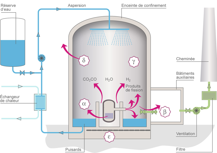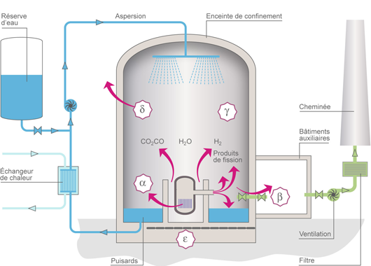- la voie dite « non-collectée » : des rejets radioactifs s’échappent par les fuites naturelles de l’enceinte de confinement.