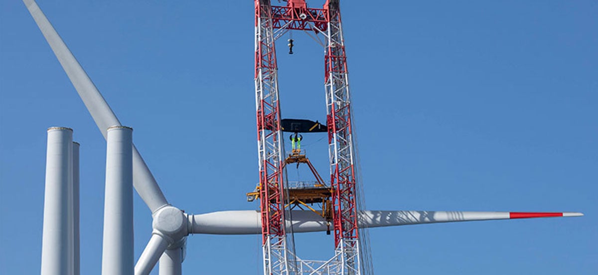 Éolienne de 7 MW en cours d'installation sur le parc offshore de Fécamp. (©C. Beyssier/EDF Renouvelables)