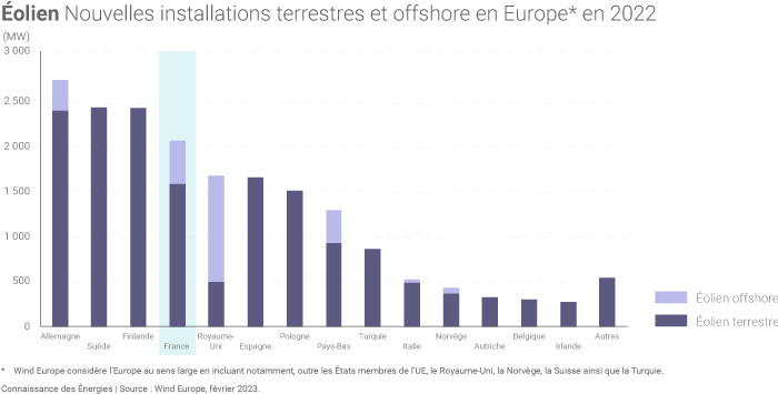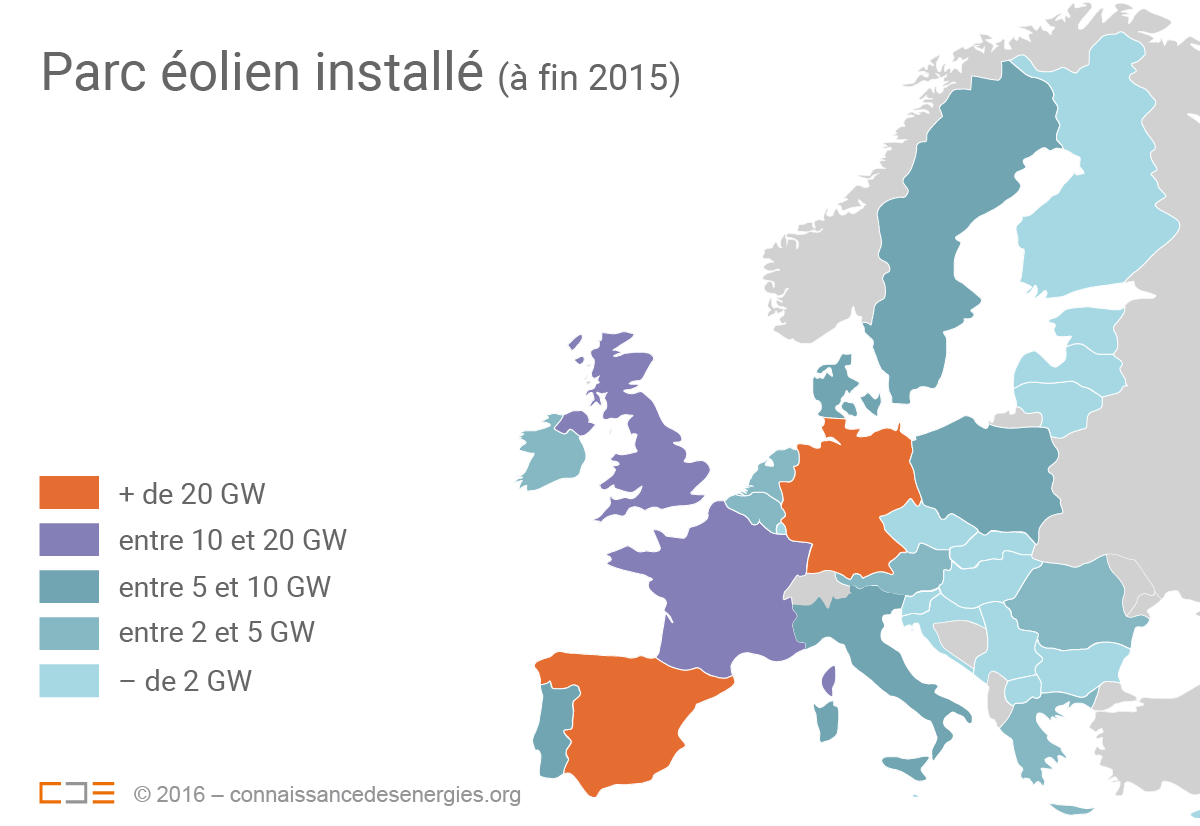 Le parc éolien français est le 4e parc éolien en Europe en termes de puissance, derrière ceux de l’Allemagne, de l’Espagne et du Royaume-Uni.