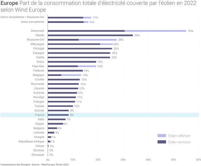 En 2022, les parcs éoliens ont produit 489 TWh dans l'Union européenne et au Royaume-Uni, couvrant ainsi près de 17% de la consommation d'électricité de cette région. Le Danemark et l'Irlande se distinguent par les parts les plus élevées d'éolien dans leur mix électrique national, avec respectivement 55% et 34% en 2022