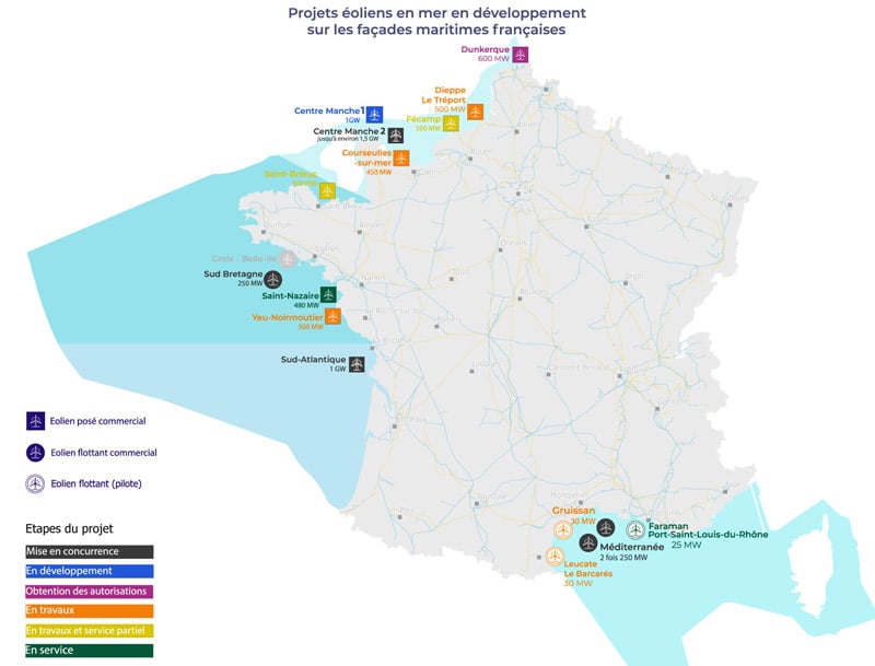 Trois grands parcs éoliens en mer sont actuellement en construction : Courseulles-sur-Mer dans le Calvados (avec 64 éoliennes totalisant près de 450 MW de puissance), Dieppe Le Tréport en Seine-Maritime (62 éoliennes pour 496 MW), et Yeu-Noirmoutier en Vendée (62 éoliennes pour 496 MW), tous prévus pour une mise en service en 2025.