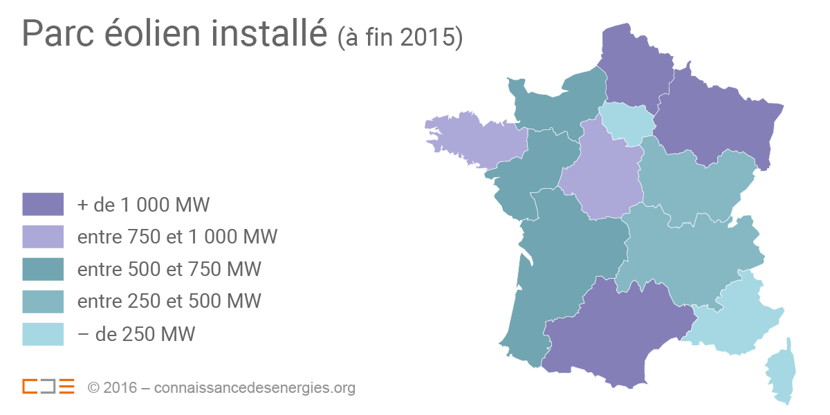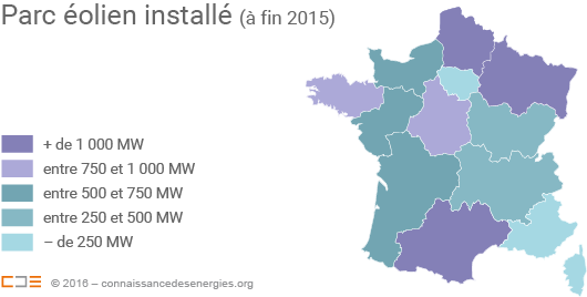 Le parc éolien français est assez inégalement réparti d’un point de vue géographique. Cette inégalité de répartition n’est pas uniquement due aux conditions climatiques, les zones géographiques les plus ventées n’étant pas nécessairement celles qui disposent des plus grandes capacités installées (par exemple, le Languedoc-Roussillon). Elle s’explique également par des facteurs économiques, politiques ou sociaux.