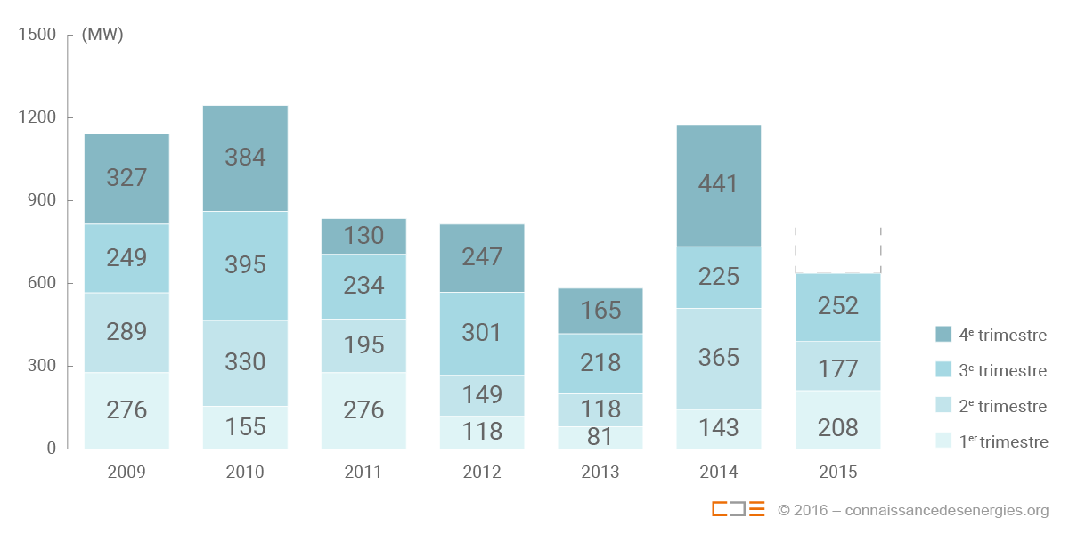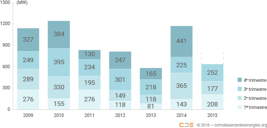 Les nouveaux raccordements ont pendant longtemps stagné (par trimestre en MW ©Connaissance des Énergies, d'après données du Commissariat général au Développement durable)