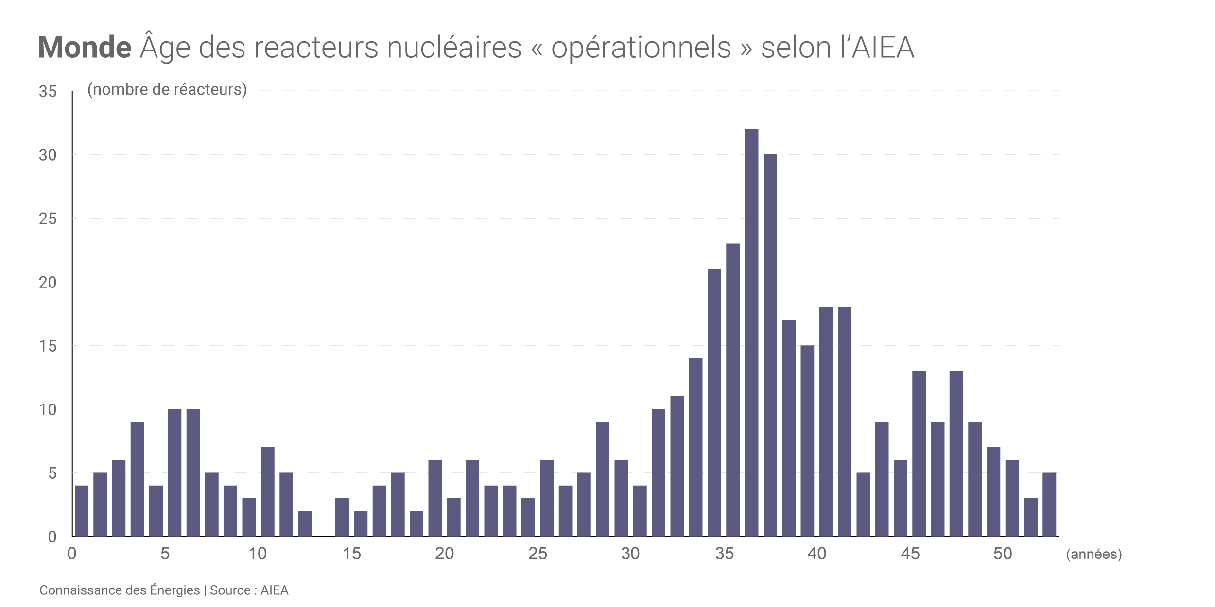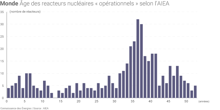 À fin septembre 2021 (graphique ci-après), les réacteurs nucléaires en fonctionnement, tous pays confondus, étaient en moyenne exploités depuis près de 31 ans. Les plus anciens d’entre eux étaient exploités depuis environ 52 ans (cas de 5 réacteurs).