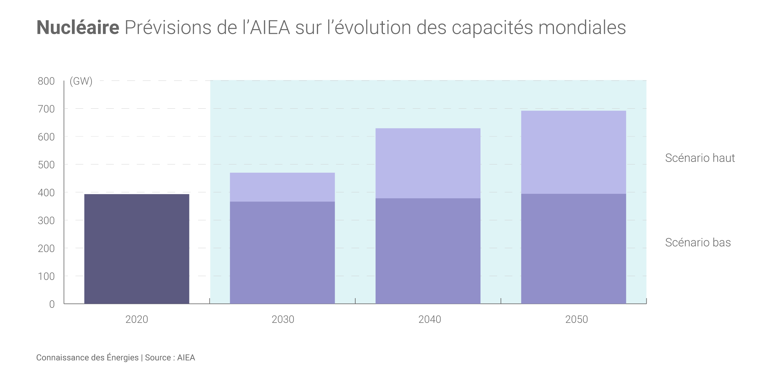 Dans son scénario « haut », l’AIEA estime que les capacités nucléaires installées dans le monde pourraient approximativement doubler d’ici à 2050 et atteindre 792 GW à cet horizon (contre 393 GW à fin 2020). Dans son scénario « bas », l'Agence envisage une relative stabilité des capacités nucléaires mondiales (392 GW en 2050).