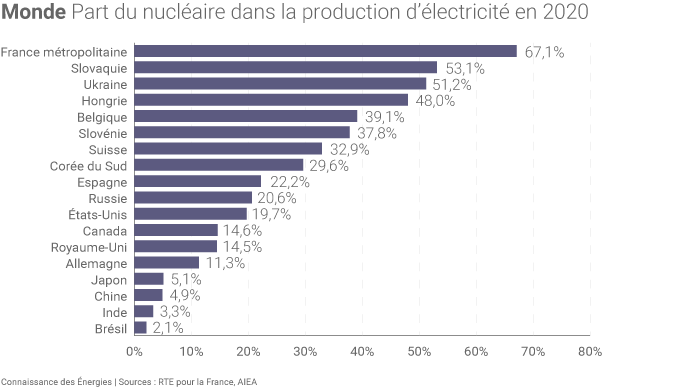 La France est le pays dont la part d’électricité d’origine nucléaire est la plus importante : de l'ordre de 67,4% en 2024 selon les dernières données de RTE.