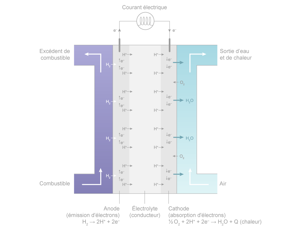 Une pile à combustible permet de convertir directement de l’énergie chimique de combustion en énergie électrique, en chaleur et en eau. Cela passe par une réaction chimique produisant un transfert d'électrons, qu'on appelle oxydo-réduction.