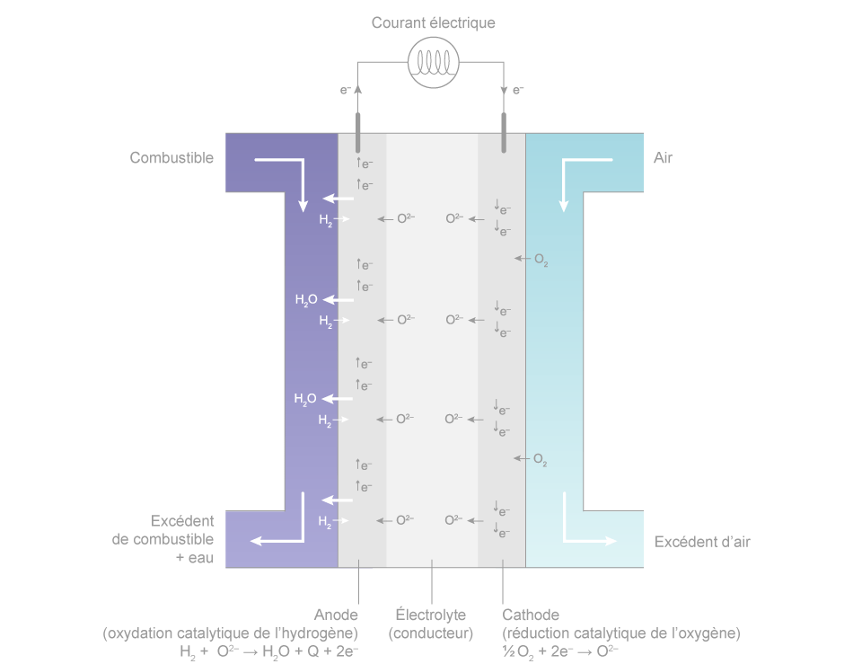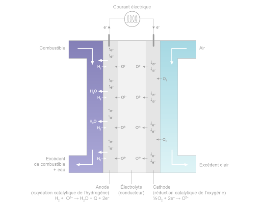 Dans les deux cas, les électrons sont libérés sur l’anode puis, bloqués par l’électrolyte, passent par le circuit extérieur de la pile et fournissent de l’énergie électrique (force électromotrice) avant de se recombiner sur la cathode avec l’oxygène.