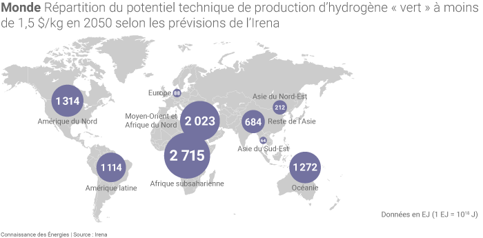 Dans un rapport(2) publié en janvier 2022, l'Agence internationale pour les énergies renouvelables (Irena) estimait que l'hydrogène pourrait compter pour près de 12% de la consommation mondiale d'énergie en 2050 et qu'environ 30% de l'hydrogène mondial « pourrait être dédié au commerce transfrontalier » à cet horizon (soit davantage que le gaz naturel aujourd'hui).