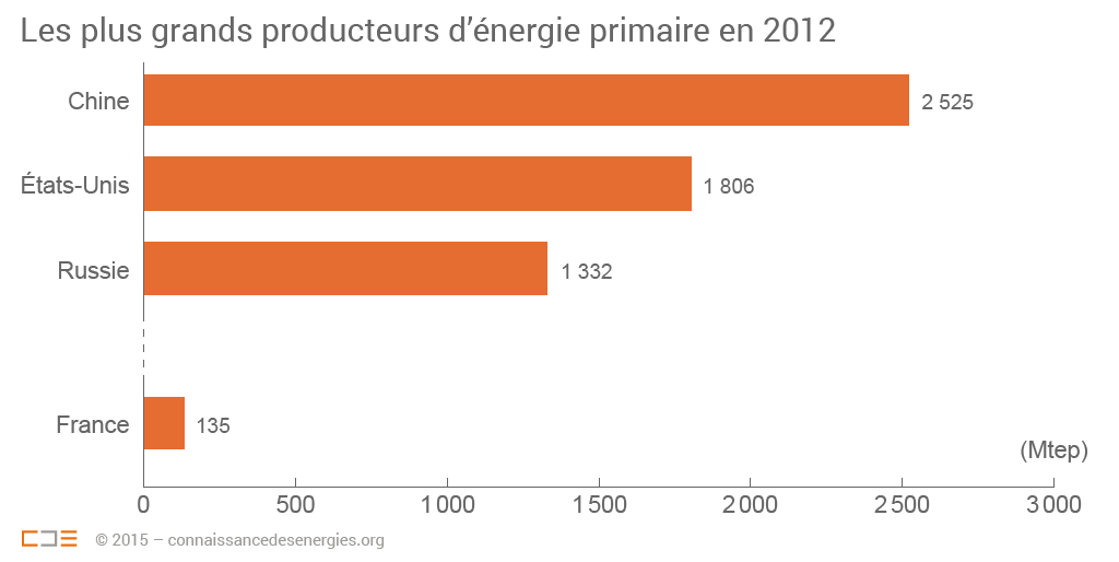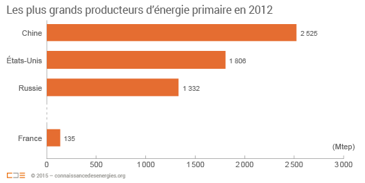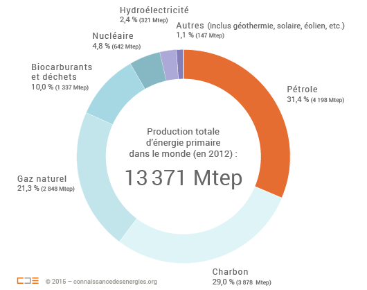 Production mondiale d'énergie primaire en 2012. Le graphe montre la forte croissance des renouvelables en un peu plus de 10 ans.