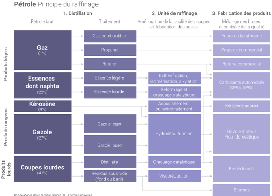 Le raffinage permet de transformer du pétrole brut en de nombreux produits aux usages différents. (©Connaissance des Énergies)