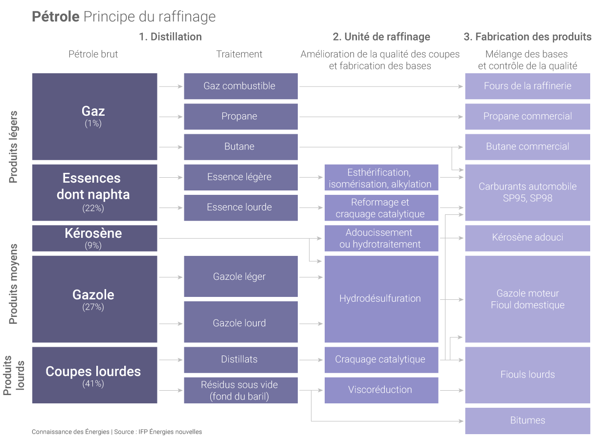 Le raffinage du pétrole est un procédé industriel qui permet de transformer le pétrole brut en différents produits finis tels que l’essence, le fioul lourd ou le naphta. Le pétrole brut est inutilisable en l’état. C'est un mélange hétérogène d’hydrocarbures divers, fait de molécules composées d’atomes de carbone et d’hydrogène. Ses composants doivent être séparés afin d’obtenir les produits finaux exploitables directement. On en distingue en général deux grands types :