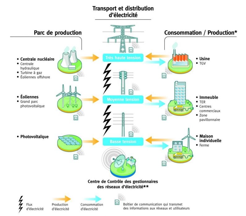 - les producteurs d’électricité comme EDF alimentent les réseaux de transport d’électricité et doivent être capables de répondre en temps réel à la demande. Le développement des smart grids permet également aux producteurs décentralisés de petites capacités (ex : les éoliennes ou les panneaux photovoltaïques appartenant à des particuliers) d’être raccordés ;