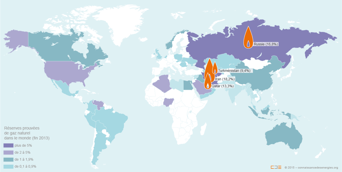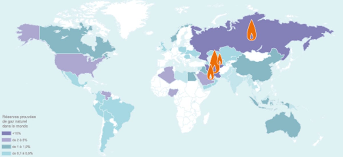 La Russie, l'Iran et le Qatar sont les 3 pays disposant des plus grandes réserves nationales de gaz naturel au niveau mondial (près de la moitié des réserves mondiales à eux 3).