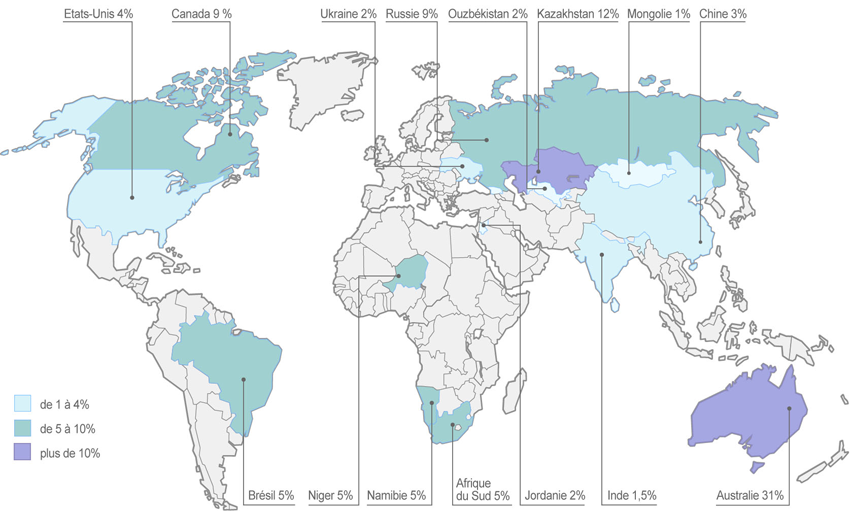 Les recherches des géologues permettent de savoir que d’importants gisements d’uranium restent à exploiter en Australie et au Canada. D’autres pays politiquement instables possèdent également d’importants gisements mais l’exploitation y est faible.