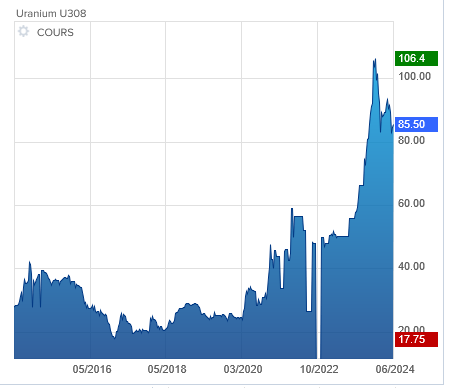 En janvier 2024, le cours Uranium U308 a atteint un sommet de 106,40 $ avant de subir une baisse de 6 %, et se stabilisant autour de 85,50 $ depuis. Malgré la baisse récente, le prix de l'uranium montre une croissance impressionnante à plus long terme. En effet, sur une période d'un an, le prix a augmenté de plus de 50 %, tandis que sur trois ans, il a bondi de 165 %, et sur cinq ans, de 250 %. Cette tendance haussière à long terme est illustrée par une augmentation de plus de 200 % sur dix ans, marquant une reprise significative depuis ses niveaux les plus bas autour de 17,75 $.