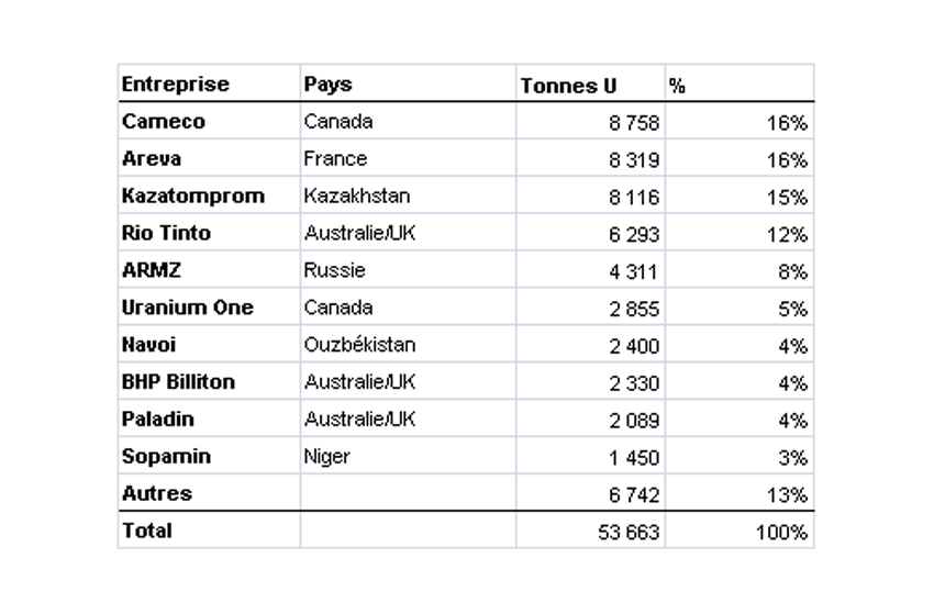 10 compagnies se partagent 94% du marché de l'extraction de l'uranium dans le monde. Parmi elles, les trois plus importants producteurs d’uranium sont Kazatomprom (Kazakhstan), Orano (France) et Cameco (Canada). Toutes ces grandes compagnies sont nées des pays possédant les réserves en uranium naturel les plus importantes, à l’exception d’Orano (ex Areva).