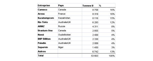 EntreprisePays d'origineTonnes U% de la production mondiale