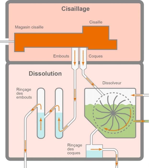 Après avoir séjourné pendant plusieurs années en piscine, le combustible est amené aux ateliers de cisaillage. Les crayons de combustible sont coupés en tronçons de 35 mm de longueur (appelés les coques). Ces coques tombent par gravité dans une roue de dissolution (dissolveur). Les embouts de pieds et de tête des crayons sont traités à part dans un rinceur à embouts car ils ne contiennent pas de matières nucléaires. En effet, ils sont là pour assurer le maintien des crayons contenant les matières nucléaires.
