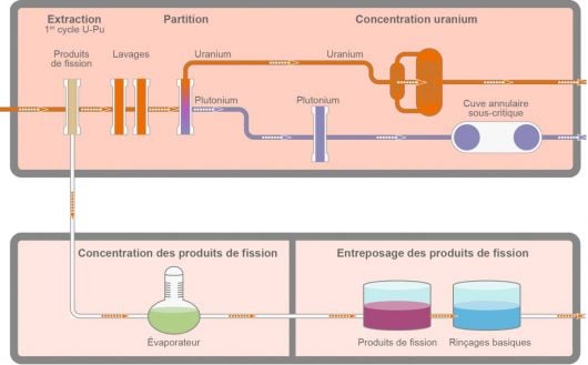 Schéma d’extraction et de séparation du plutonium, de l’uranium et des produits de fission, (d'après source Areva, ©CDE)