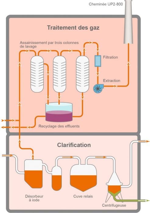 Les effluents gazeux issus de la dissolution sont ensuite traités, lavés et filtrés alors que la solution d’acide est clarifiée. La centrifugeuse permet de séparer, d’une part les « fines » de cisaillage (copeaux de Zircaloy) et les produits de fission insolubles dans la solution d’acide et d’autre part, l’uranium, le plutonium, l’acide nitrique et des produits de fissions solubles.
