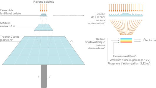Le solaire photovoltaïque « à concentration » consiste à capter le rayonnement solaire grâce à un pavage d'optiques (lentilles ou miroirs) de faible coût pour le concentrer sur une surface beaucoup plus réduite (1/1000e) où l’on place une cellule solaire de petite dimension à haute performance.
