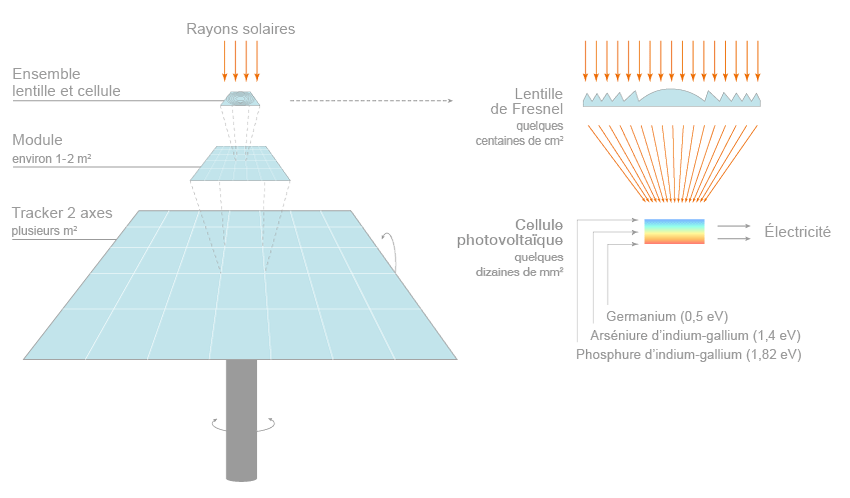 L’empilement des matériaux photoélectriques III-V (catégories des éléments dans le tableau de Mendeleïev(1) : As, Ga, In, P, B) constituant les cellules à hautes performances est tel que le spectre du rayonnement solaire converti en énergie électrique est plus étendu que dans les cellules photovoltaïques à silicium (IV). Pour un même flux solaire capté, les rendements énergétiques atteints aujourd’hui (30% à 40% pour l’ensemble lentille et capteur) sont doubles de ceux des panneaux solaires photovoltaïques à insolation directe (autour de 10% et jusqu’à 20%). Le potentiel de ces structures permet d’espérer atteindre à terme un rendement de conversion du flux solaire en énergie électrique supérieur à 50%.