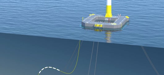 Sur le site d’essais, l’éolienne « Floatgen » sera ancré à 33 m de profondeur à l’aide de 2 lignes à l’avant de la barge flottante et de 4 lignes à l’arrière. (©Ideol)