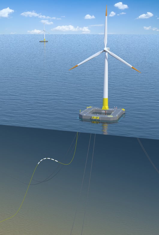 A long terme, l’éolien flottant présente un potentiel important par rapport aux éoliennes « posées » qui sont limitées à des zone de faibles profondeurs (40 m à 50 m au maximum)(5). Pour l’heure, l’éolien flottant reste encore peu développé (une ferme commerciale dans les eaux écossaises et quelques démonstrateurs au Japon, en Norvège et au Portugal) alors que l’Europe comptait déjà près de 3 600 éoliennes posées au large de ses côtes à fin 2016(6)