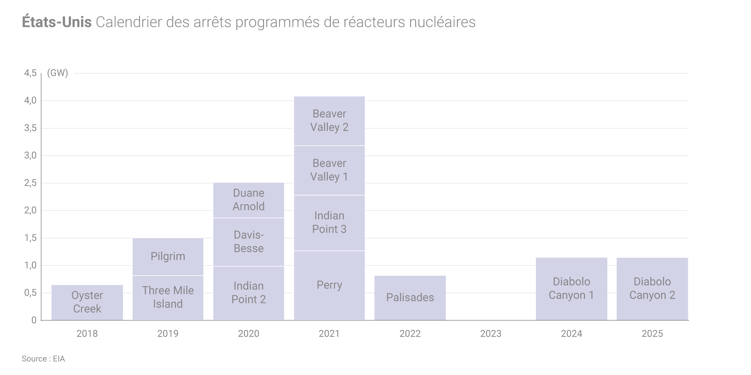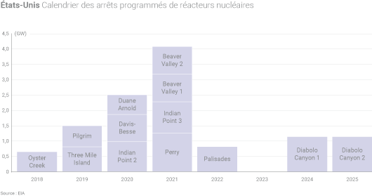 Aux États-Unis, la filière nucléaire est en particulier confrontée à des difficultés économiques dans le contexte d’une hausse modérée de la demande d’électricité et face à la concurrence accrue d’un gaz naturel peu coûteux et des énergies renouvelables, rappelle l’agence américaine en charge de l’énergie (EIA) qui qualifie « de plus en plus difficile la compétitivité des producteurs nucléaires sur les marchés de l'électricité ».