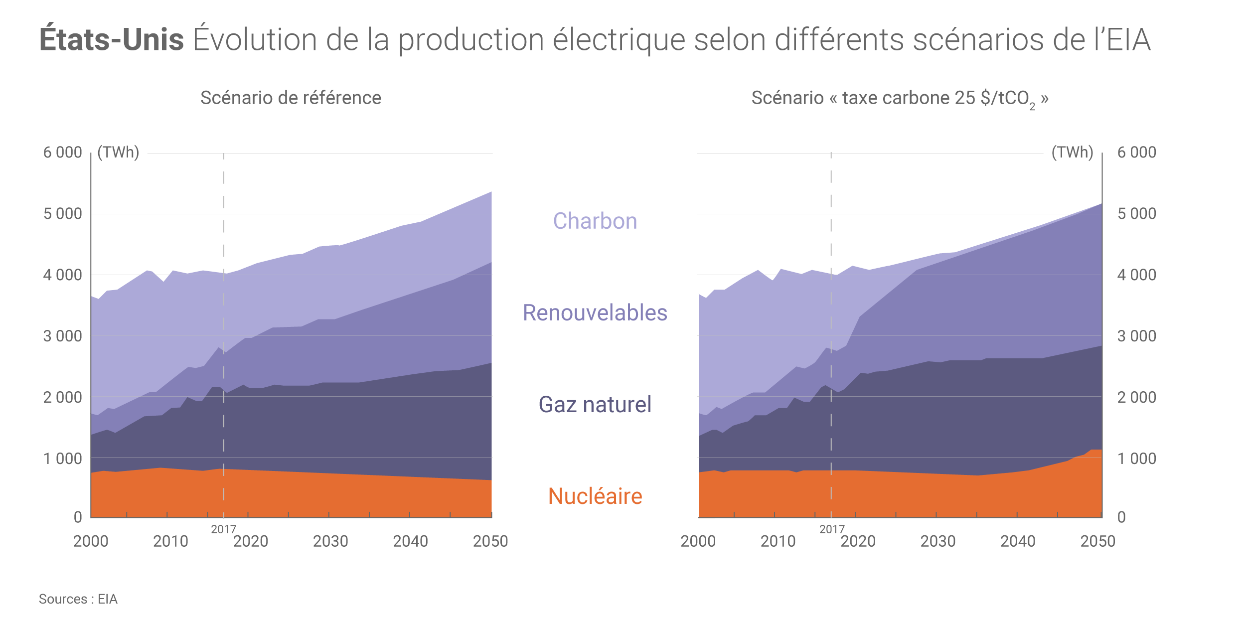 Selon les estimations de l’EIA, la puissance installée du parc nucléaire américain pourrait baisser à hauteur de 79 GW à l’horizon 2050 (scénario de référence), contre près de 99 GW à l’heure actuelle. Une très forte hausse du prix des combustibles fossiles ou l’application d’un prix du carbone élevé (25 $/ tonne de CO2 en 2020, prix renchéri de 5% par an par la suite) pourrait toutefois totalement inverser ces perspectives, indique l’EIA(6).