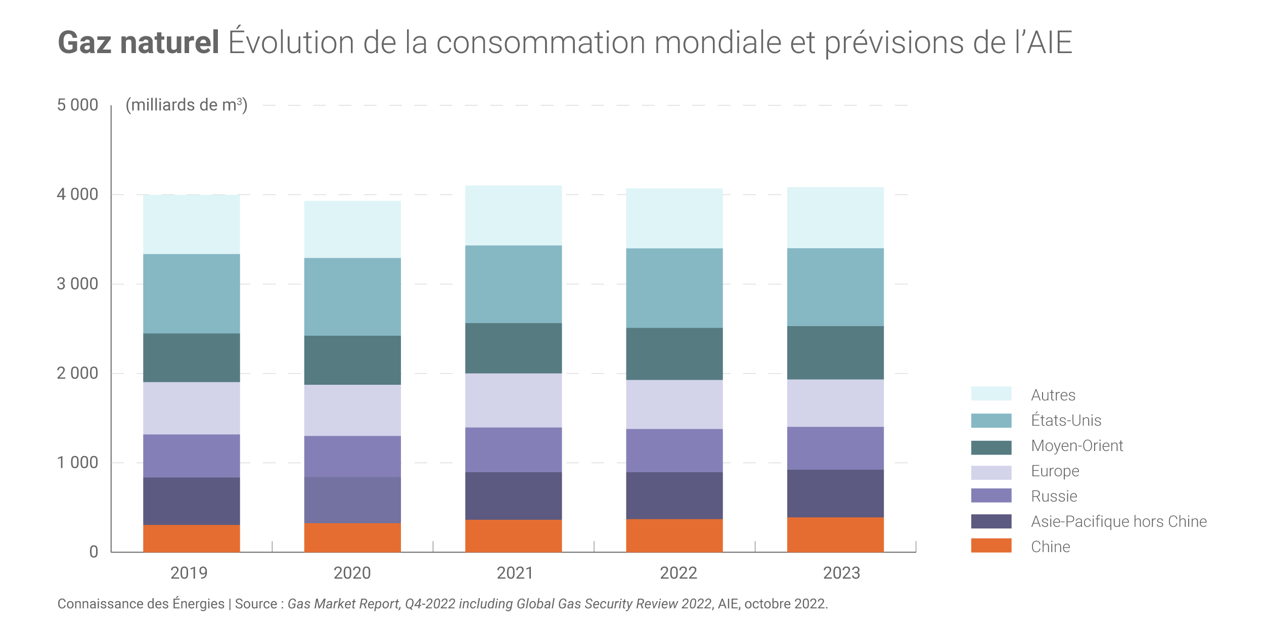 En 2022, la consommation mondiale de gaz naturel pourrait diminuer de 0,8% par rapport à 2021, avec en particulier une baisse record de plus de 10% en Europe (donnée pour les pays de la zone OCDE au cours des 8 premiers mois de l'année par rapport à la même période en 2021) et une demande inchangée dans la région Asie-Pacifique (légère hausse en Chine, baisse en Inde et en Corée du Sud).