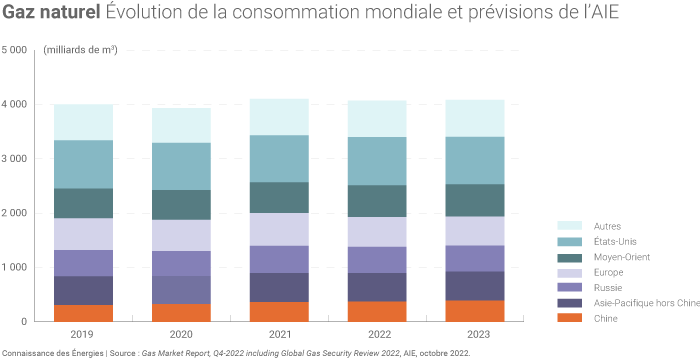 En 2022, la consommation mondiale de gaz naturel pourrait diminuer de 0,8% par rapport à 2021, avec en particulier une baisse record de plus de 10% en Europe (donnée pour les pays de la zone OCDE au cours des 8 premiers mois de l'année par rapport à la même période en 2021) et une demande inchangée dans la région Asie-Pacifique (légère hausse en Chine, baisse en Inde et en Corée du Sud).