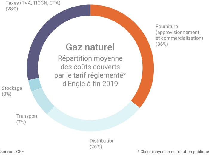 1. Avec un délai de 2 à 11 mois selon les cotations. L’article R. 445-2 du code de l’énergie dispose que « les tarifs réglementés de vente du gaz naturel couvrent les coûts d'approvisionnement en gaz naturel et les coûts hors approvisionnement. Ils comportent une part variable liée à la consommation effective et une part forfaitaire calculée à partir des coûts fixes de fourniture du gaz naturel ». Bien qu’abrogé par la loi énergie-climat de novembre 2019, cet article reste applicable aux contrats de fourniture de gaz déjà souscrits jusqu’aux échéances mentionnées précédemment.