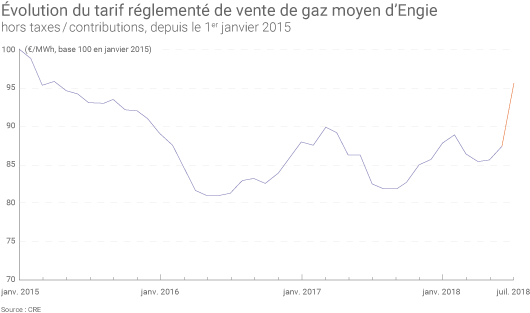 Notons que la formule de calcul des coûts d’approvisionnement en gaz d’Engie évolue également dans l’arrêté du 28 juin 2018(2) (par rapport à celui du 30 juin 2017 jusqu’ici en vigueur). Elle « supprime les références à l’indice Brent et au taux de change dollar US contre euro et repose désormais uniquement sur des indices portant sur le marché de gros du gaz naturel », précise la CRE(3).