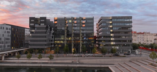 Vue extérieure des trois bâtiments d'Hikari dans le quartier lyonnais de la Confluence. (©Olivier Guerrin)