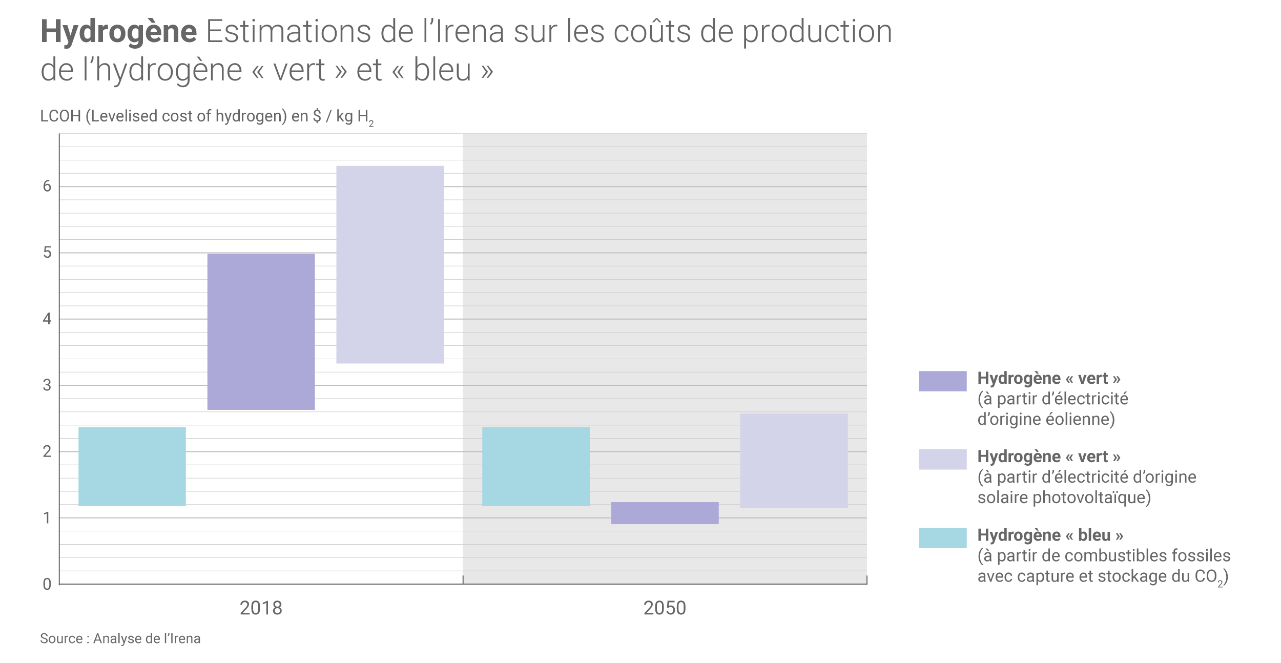 Selon l'Irena, l'hydrogène « vert » est « actuellement deux à trois fois plus coûteux que l'hydrogène bleu » (c'est à dire produit à partir d'énergies fossiles mais avec capture et stockage du CO2 émis), lui-même plus cher que le gris.